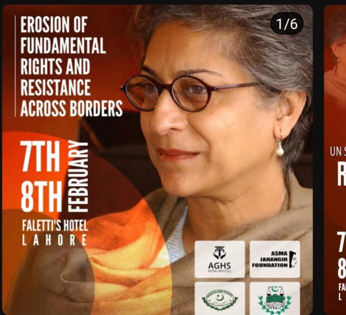 لاہور: (ویب ڈیسک )عاصمہ جہانگیر لیگل ایڈ سیل کا چھٹی عاصمہ جہانگیر کانفرنس (AJCONF) کے انعقاد کا اعلان کر دیا ہے، کانفرنس 7 اور 8 فروری 2026 کو لاہور کے فلیٹیز ہوٹل میں منعقد ہوگی۔ ’بنیادی حقوق کا زوال اور سرحد پار مزاحمت‘ کے عنوان سے ہونے والی یہ دو روزہ کانفرنس سپریم کورٹ بار ایسوسی ایشن اور پاکستان بار کونسل کے اشتراک سے منعقد کی جا رہی ہے۔