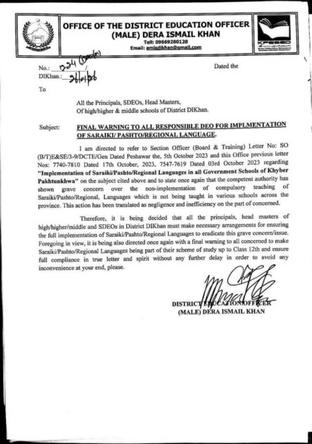 ڈسٹرکٹ ایجوکیشن آفیسر (میل) ڈیرہ اسماعیل خان نے سرکاری سکولوں میں سرائیکی زبان کی تدریس کو لازمی قرار دیتے ہوئے احکامات جاری کر دیئے ہیں۔ مراسلے کے مطابق جماعت ششم سے بارہویں تک سرائیکی یا علاقائی زبان کو نصاب کا باقاعدہ حصہ بنائے جانے کا کہتے ہوئے سکول سربراہان کو ہدایات دی گئی ہیں کہ وہ سرائیکی نصاب کی تدریس کو یقینی بنائیں۔